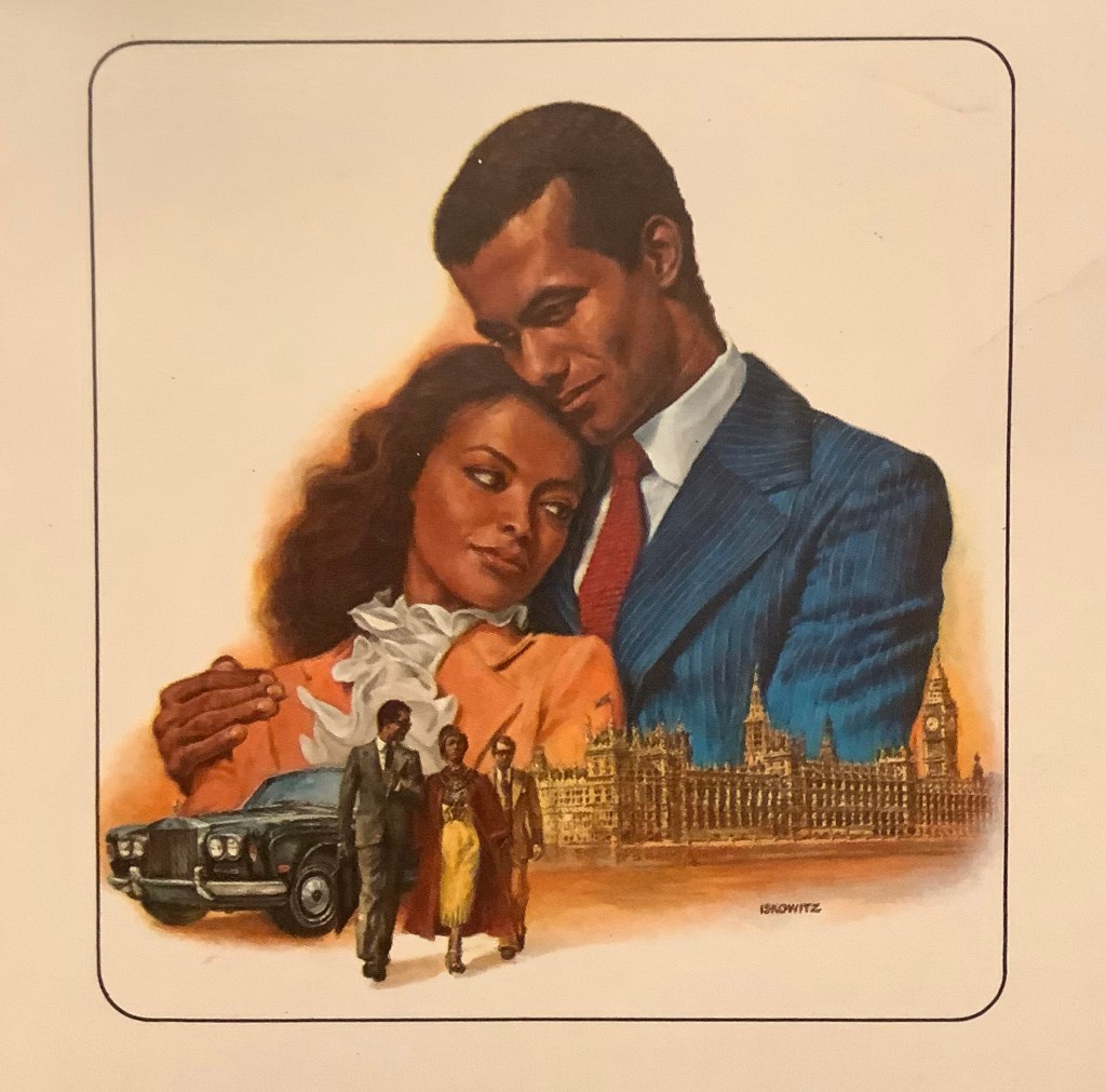 The simple vignette by artist Joel Iskowitz sets the scene in London and gives us magazine correspondent Kathy in an embrace with oil tycoon Lloyd. As innocuous as it seems, it marked the first time a category romance publisher had featured a Black couple on the cover. Harlequin wouldn’t catch up until Sandra Kitt’s Adam and Eva, purchased by Vivian Stephens during her short time with the company, four years later.